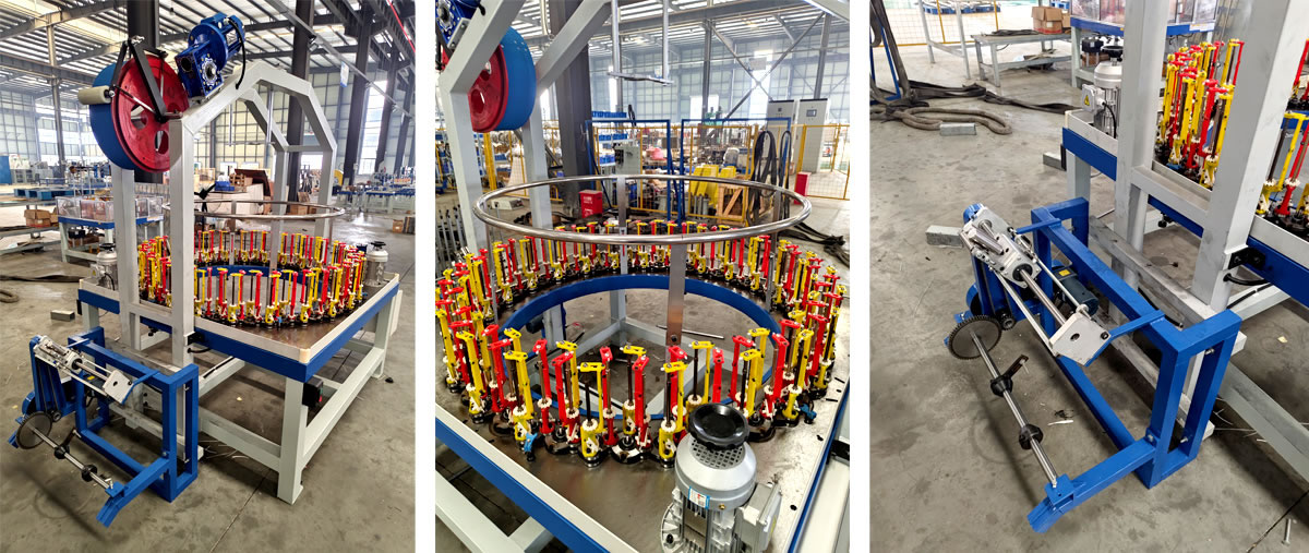 含收线,撑线盘,中心芯管,380V,三相,信捷,90锭子0.6簧,47*142mm纱管,可缠绕膜密封,现场安装调试,额外带0.5弹簧。1.龙门架,大宽平滚筒+双压辊,双槽分线轮,后带双压落线。2.带不锈钢撑线圈。3.90弹锭,装0.6簧,另送0.5簧。4.编织电机0.75KW*2,牵引电机0.75KW*1,双变频调速。5.带收排线架,120W收线电机,适用标准500线盘。